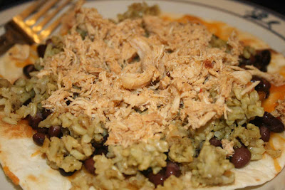 Serve with the crisp cheesy tortilla on the bottom, then layer the black beans, rice, lettuce, chicken, and dressing.