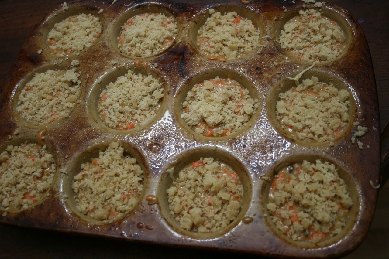 Combine all the dry streusel ingredients in small bowl. Drizzle with the warm, melted unsalted butter and toss with fork until evenly moistened and mixture forms large chunks with some pea-sized pieces throughout. Before baking, top the filled muffin cups with the streusel topping.